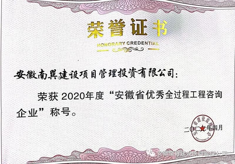 近日,安徽省建设监理协会公布《关于表扬安徽省建设监理协会2020年度优秀全过程工程咨询企业的决定》,我司荣获“安徽省建设监理协会2020年度优秀全过程工程咨询企业”荣誉称号。